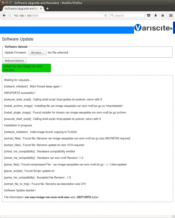 - On the web page, click "Browse..." and open the .swu image which is located at tmp/deploy/images/imx6ul-var-dart/var-image-swu-imx6ul-var-dart.swu