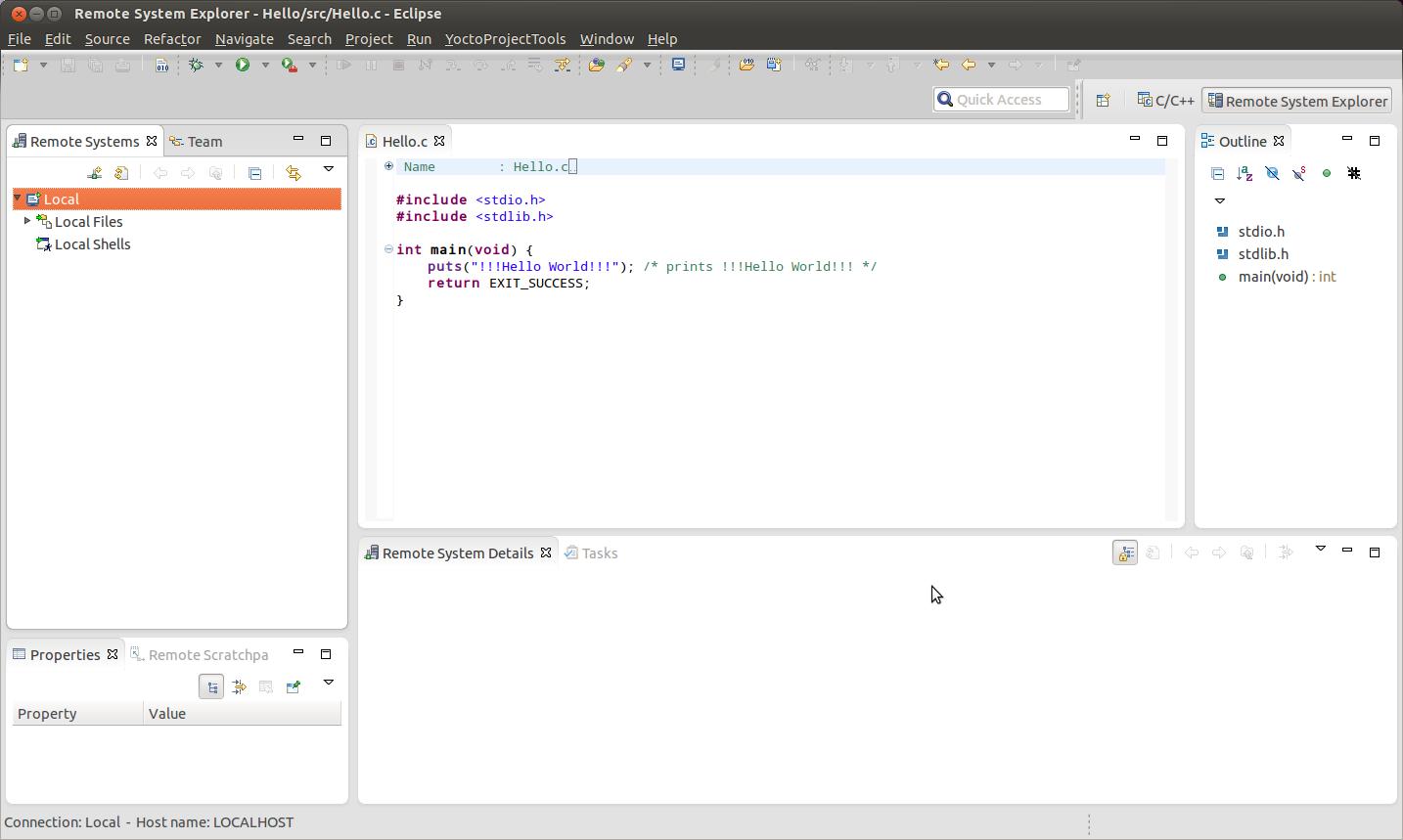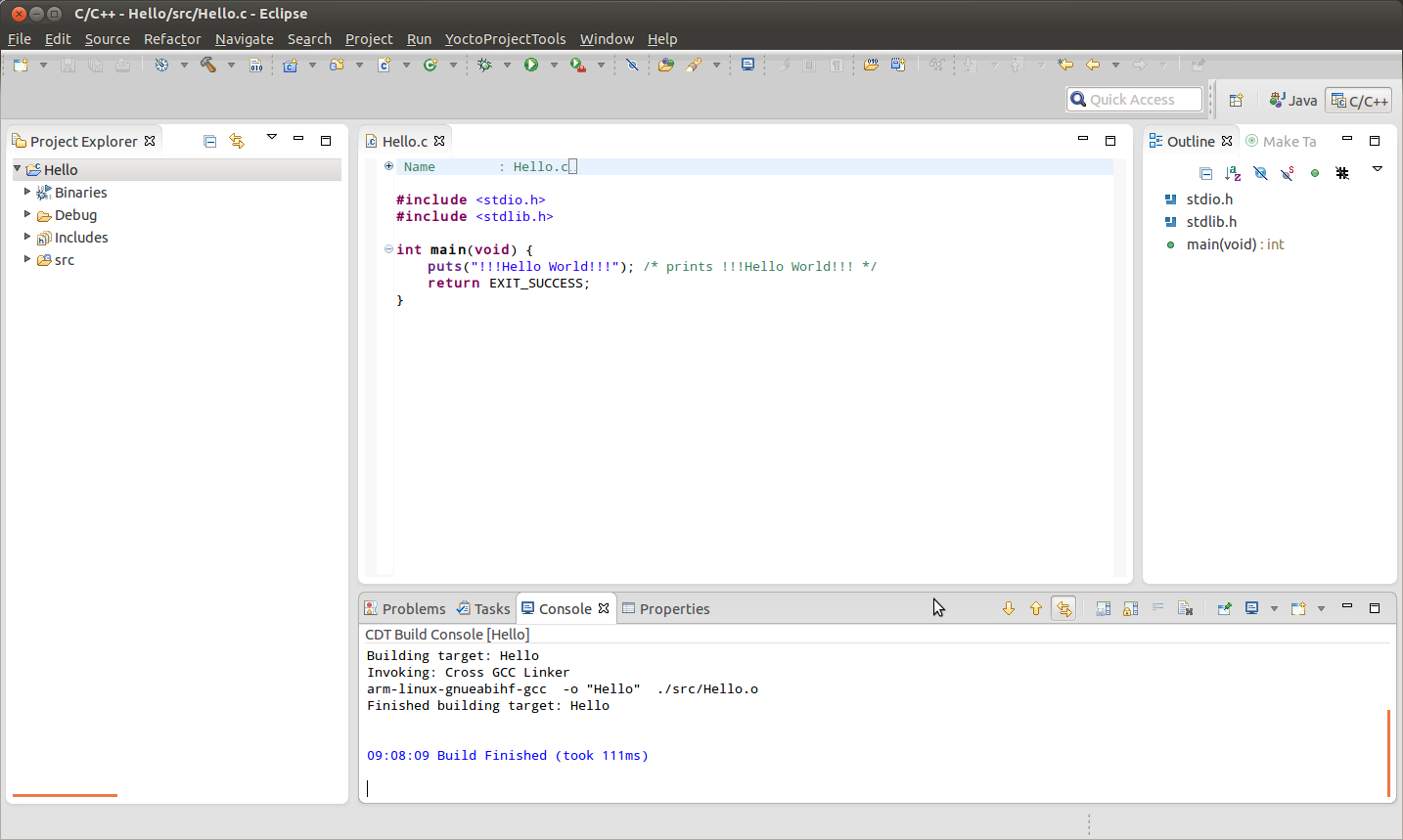 Switch back to the c/c++ view. Click on the Hello project from the left tab.