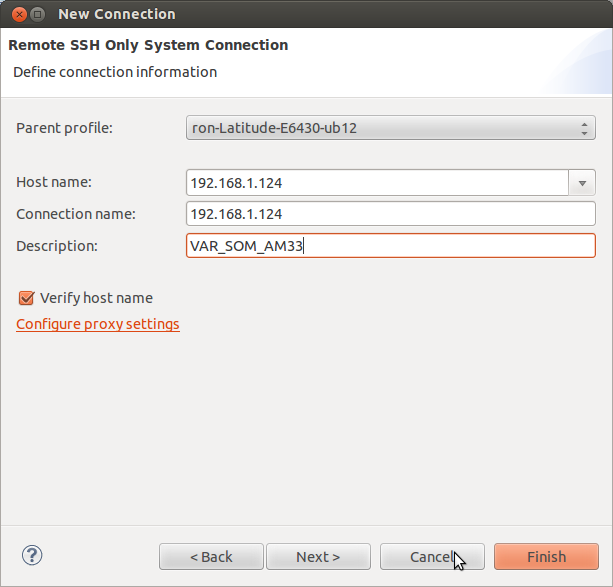Hit finish to create the remote connection. Right click on the new connection name and hit connect.