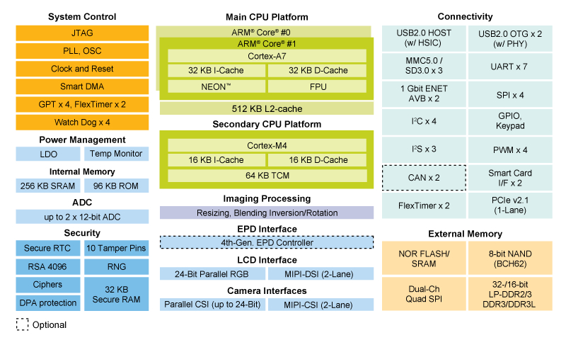 The i.MX7 utilize both the ARM Cortex-A7 and Cortex-M4 cores for general-purpose programmable processing.