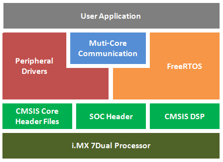 Demo and example applications are provided to demonstrate peripheral drivers, FreeRTOS kernel, RPMsg usage and to highlight the main features of the i.MX 7Dual processor. Next figure highlights the layers and features of the FreeRTOS BSP for i.MX 7Dual.