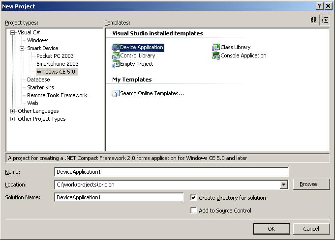 - Choose "Visual C# -> Smart Device -> Windows CE 5.0"